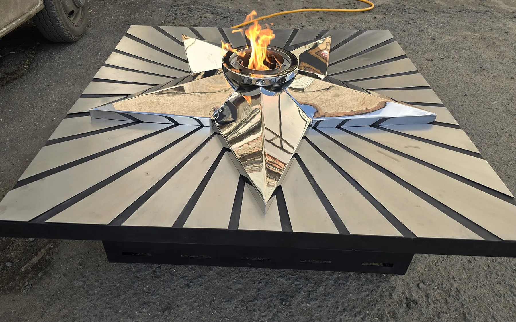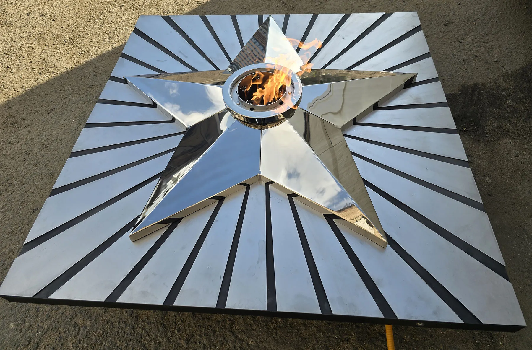 Мобильная группа оборудования «Вечный огонь» - это действующая модель настоящего вечного огня. Компактные размеры и небольшой вес позволяют использовать изделие в формате выездного мероприятия. Высота пьедестала 350 миллиметров, габариты пьедестала по верхнему срезу 1200 хь1200 мм. Модель оснащена устройством искрового розжига пламени, работает розжиг по нажатию пусковой кнопки на передней панели изделия. Топливо – сжиженный газ (пропан), гибкая линия подвода газа позволяет вынести баллон с газом на расстояние до 50 метров от места расположения самого мобильного модуля. Оборудование сертифицировано, безопасно и функционально. Для работы модуля используется газовая ветроустойчивая горелка модели ГВД 379 10 89 00 ПС. Изделие производится и поставляется в продажу группой компаний NSO-PiroClub